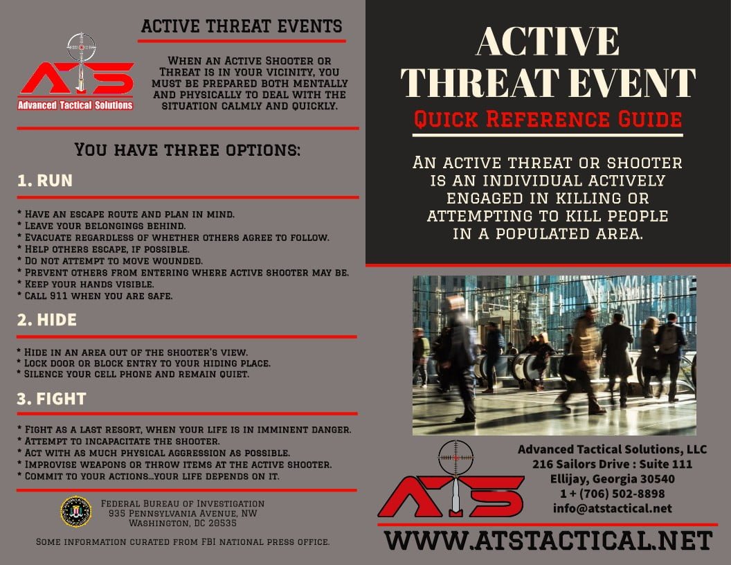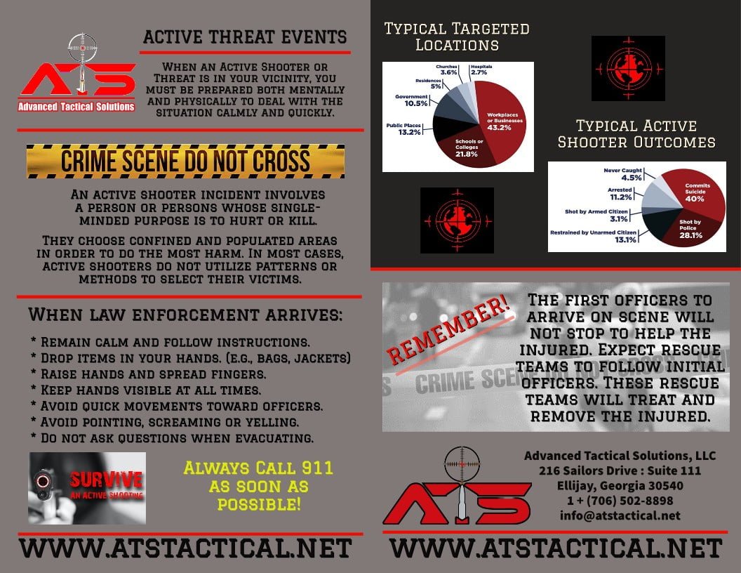 These kind of events highlight the need to reduce the risk of active shooter incidents while improving preparedness and strengthening ongoing efforts intended to prevent future occurrences. Advanced Tactical Solutions, LLC (ATS), has global professional experience in these kinds of events. We will tailor on-site training for businesses to ensure your employees and security professionals are better prepared. Our training class, (usually between 4-6 hrs. – depending on participation) reviews best practices and creates a customized plan and right mind-set that begins with proper education and training! Please contact Advanced Tactical Solutions to discuss and get a free threat assessment consultation. Reached ATS by email or by phone: (706) 502-8898. www.linkedin.com/in/atstactical