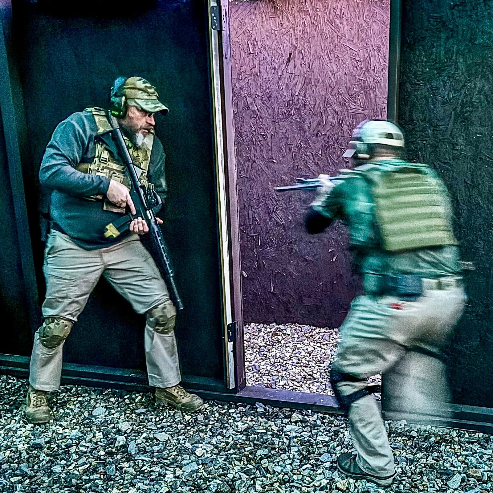 Our one-day, 10-hour CQB tactical shoot house program prioritizes basic skills. It provides a condensed, effective experience in room clearing and CQB techniques. The use of rifle and pistol transitioning is emphasized, along with scenario-based combat missions using a combination of live rounds and marking rounds.